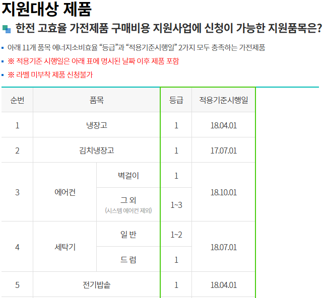 아래 품목 중 에너지 소비효율 1등급 이상 (또는 일부 2등급 포함)의 제품만 해당되며, 생산 기준일도 맞아야 합니다.