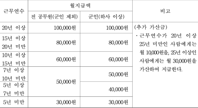 - 25년 이상: 기본 10만 원 + 30,000원 추가