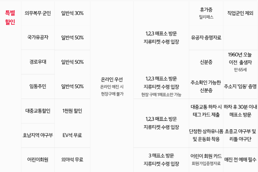 | 어린이회원 | 외야석 무료 | 매진 전 사전 예약 필수 | 회원카드, 인증 서류 |