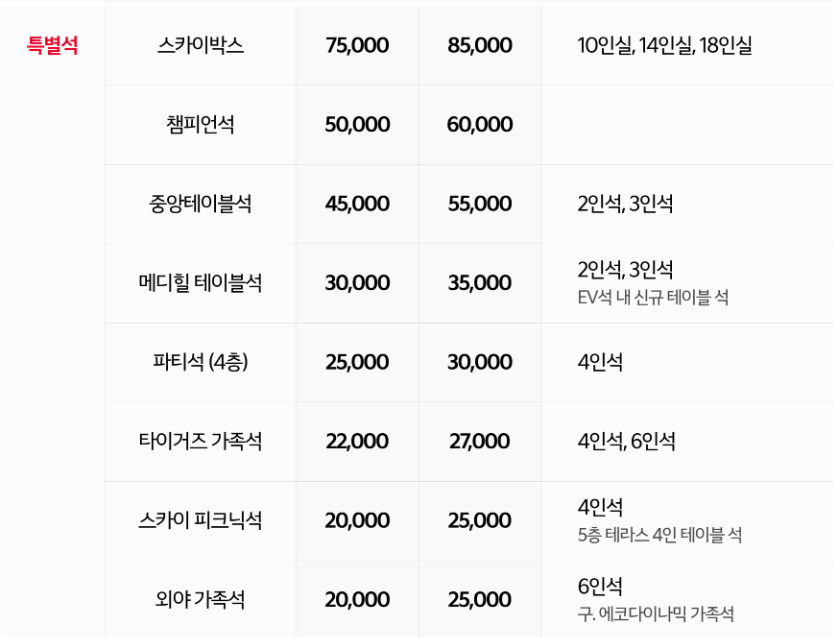 - 내야 중앙: 평일 18,000원 / 주말 20,000원