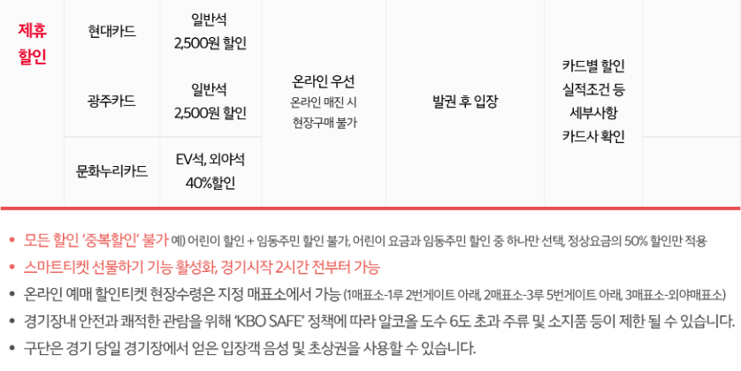 | 문화누리카드 | EV석, 외야석 40% 할인 | 해당 카드 발급자 |