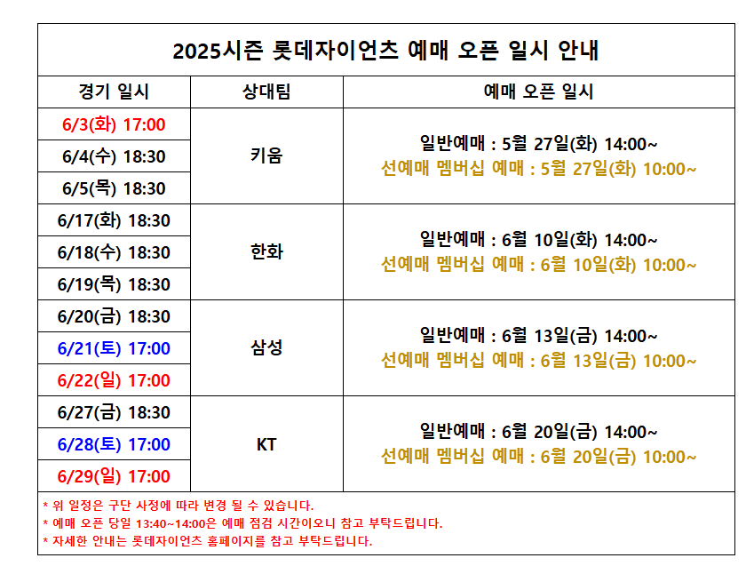 | 6월 | 3~5일: 키움 vs 롯데 | 사직 | 평일 18:30 / 주말 17:00 |