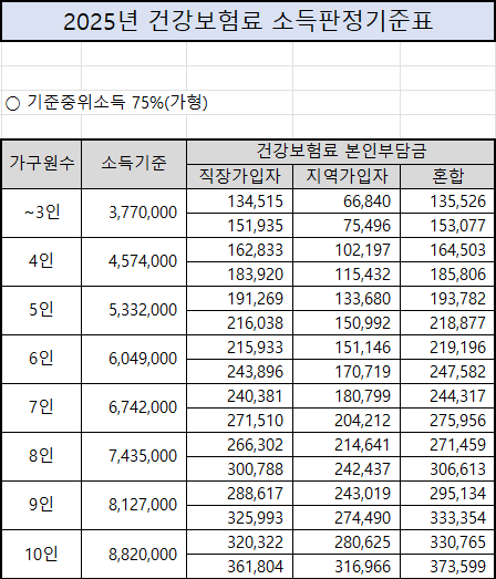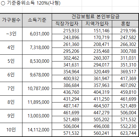 - 4인 가구 기준 중위소득(100%)인 월 609만 원~620만 원 구간이면, 직장가입자 보험료는 약 21만 5,933원