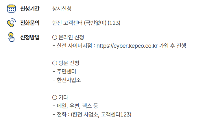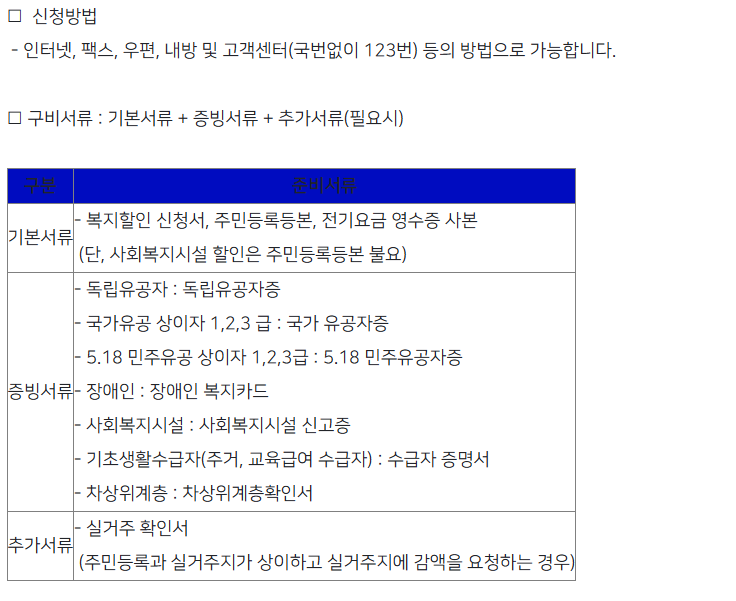 - 한전 사이버지점 또는 ‘한전 ON’ 앱 → ‘복지할인’ 메뉴