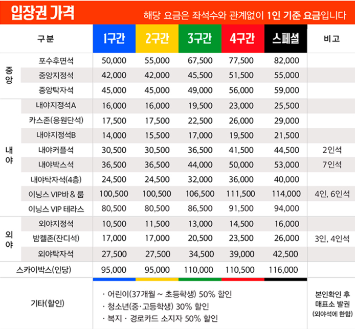 - 중앙석·가족석·커플석·잔디좌석·불펜지정석 등 다양한 옵션 제공